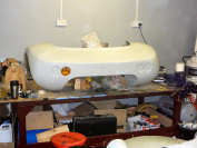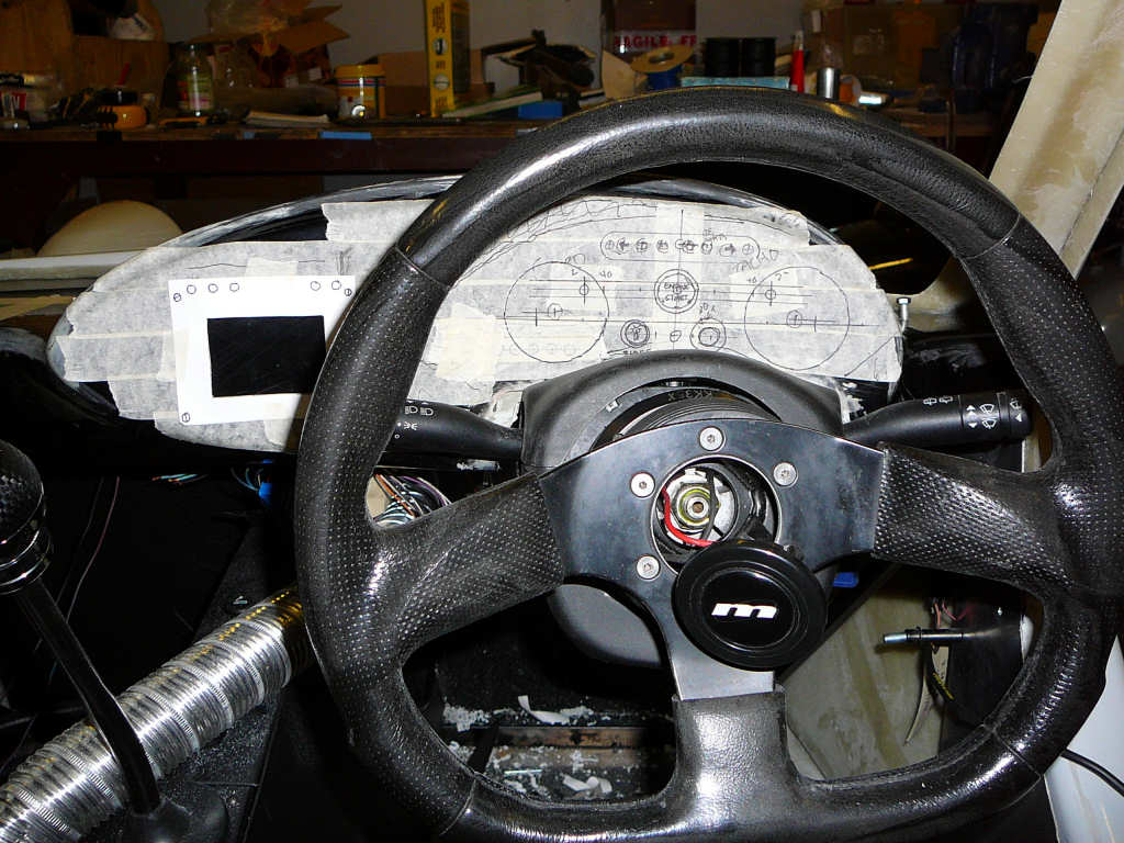 Sorry about the lack of updates.. here's a bit of a mammoth one for you though. Hope you're sitting comfortably? Over the Christmas break, I was lucky enough to have a fair amount of time out in the workshop and have consequently got a decent amount done. Being sub-zero temperatures for much of the time hasn't helped, but it's amazing how quickly you warm up when sanding bodywork! The last installment culminated in the headlights being fitted. I've since gone on to mount most of the other lights with the exception of the side indicator repeaters as I still haven't ordered them (The Fiesta side repeaters are too 'deep' to fit behind the bodywork so I'll go for some low profile LED ones soon..). First job - fit the rear lights. This was a case of using the black bezels to mark out the cut lines, then chain-drill and sand smooth. I used a rotary sanding drum in my drill to do the bulk of the sanding which resulted in a fair amount of dust but gave a nice result and didn't take too long. It certainly helps having a large bench to do this job on! The lights are NAS units from Wipac, and I got all 4 from eBay for just £12 including bulbs. I then moved on to fitting the front indicators. This required fitting the cycle wings which I've been dreading for some reason. In the end it was a relatively simple procedure in which I bent the wing stays around to even up both sides, and then cut recesses in the wings to clear them. In order to fix the wings on, I wanted to use something like a bighead fastener and bond it to the underside of the wing using fibreglass mat and resin. Unfortunately, I didn't have any bigheads, so I ended up making something similar. To do this, I got hold of a few large (40mm) fixings that are used to retain cavity wall insulation and then formed them over the heads of some M6 bolts using brute force and ignorance. I'm wishing I took some photos of these now because its hard to describe and a photo would really help. Oh well.. Once these were ready, I drilled 8 holes in the wing stays and dropped the big bolts in loose. I put a dab of Tigerseal on the head of each bolt and the lowered the cycle wing into position. Once this had dried, I carefully lifted the wing off, turned it upside down and fibreglassed the bolts in place. When I read Neil Everett's build diary, he came across a slight problem when removing the wings since the bolts naturally point towards each other making it impossible to lift the wing off straight. In readiness for this, I made the holes in the forward most wing stays into slots which cures the problem. I'll use some largish washers during the final fit to ensure that the wings stay where they're meant to! One thing to say about doing this kind of fibreglass work - it's not difficult (in fact it's quite easy) but it can get very messy! Be prepared to get resin everywhere! I left the fibreglass to set overnight, then added a second layer. This was left for another night to harden and then I fitted the front indicators. A simple matter of measure, make, drill, and fit. The indicators I'm using came from S-V-C and have a metal base, carbon effect housing, and a clear lens. This was bent to fit the contour of the wing and the top plastic was filed to match, which should help them to sit flat and level. The bulbs fitted are coloured, but they look a little yellow to me. The SVA/IVA manuals state that these indicators must be 'the correct colour', and this is only ever identified as 'amber'. I think I'll get some other bulbs just in case. I've also finished the plumbing of the heater matrix. I've plumbed some 15mm pipe into the heater circuit of the engine coolant system and connected this to the original Fiesta heater valve. This valve is electronically operated and either allows hot water to flow through the heater matrix, or bypasses the matrix and returns the water directly back to the engine. The heater valve is just a simple 12V solenoid and I'll need to make up some electronics to drive it but I'll do that later. The heater valve is supported on a bracket and is located at the front of the tunnel. I think I'll have to put some sort of inspection hatch in the passenger footwell just in case I ever need to get to it again. You may also just be able to make out the new coolant temperature sender in the right hand photo above. This sender comes with my new Koso speedo and tacho mentioned previously so it needed to be installed somewhere suitable. I got a 32mm adaptor from Car Builder Solutions which fitted perfectly (the sender is a standard M10 thread, and so is the adaptor). I've since mounted the heater box down to the chassis using a bracket but this isn't shown above unfortunately. I've refilled the coolant system and bled the matrix and there's no leaks so far which bodes well. Whilst mucking around in the tunnel, I've fitted the handbrake switch. I've reused one of the door switches from the Fiesta for this since they're robust and easy to mount. Back to bodywork for a while: I measured, marked, and then cutout the engine cover to allow it to fit around the rollbar. Although not difficult, this was a bit of a test of confidence since there is almost nothing to reference any measurement from! i ended up using a large sheet of cardboard and trimming it away until I had a suitable template. Once I was happy with this, I used it to transfer the marks to the fibreglass and got cutting. Fortunately, the hard work was worth it and it fits perfectly! Phew. I've also fitted the bonnet hinges. This was a simple job that only took a few moments. These are held on with M8 nuts and bolts with some larger washers to help spread the load and prevent cracking of the fibreglass. As you can see, I've used some small jubilee clips to stop the hinges moving from side to side along the bar. I've ordered some flush bonnet locks from Rally Design which should turn up soon. I've started fitting the rear bodywork which is more of a struggle for several reasons. It's on ho